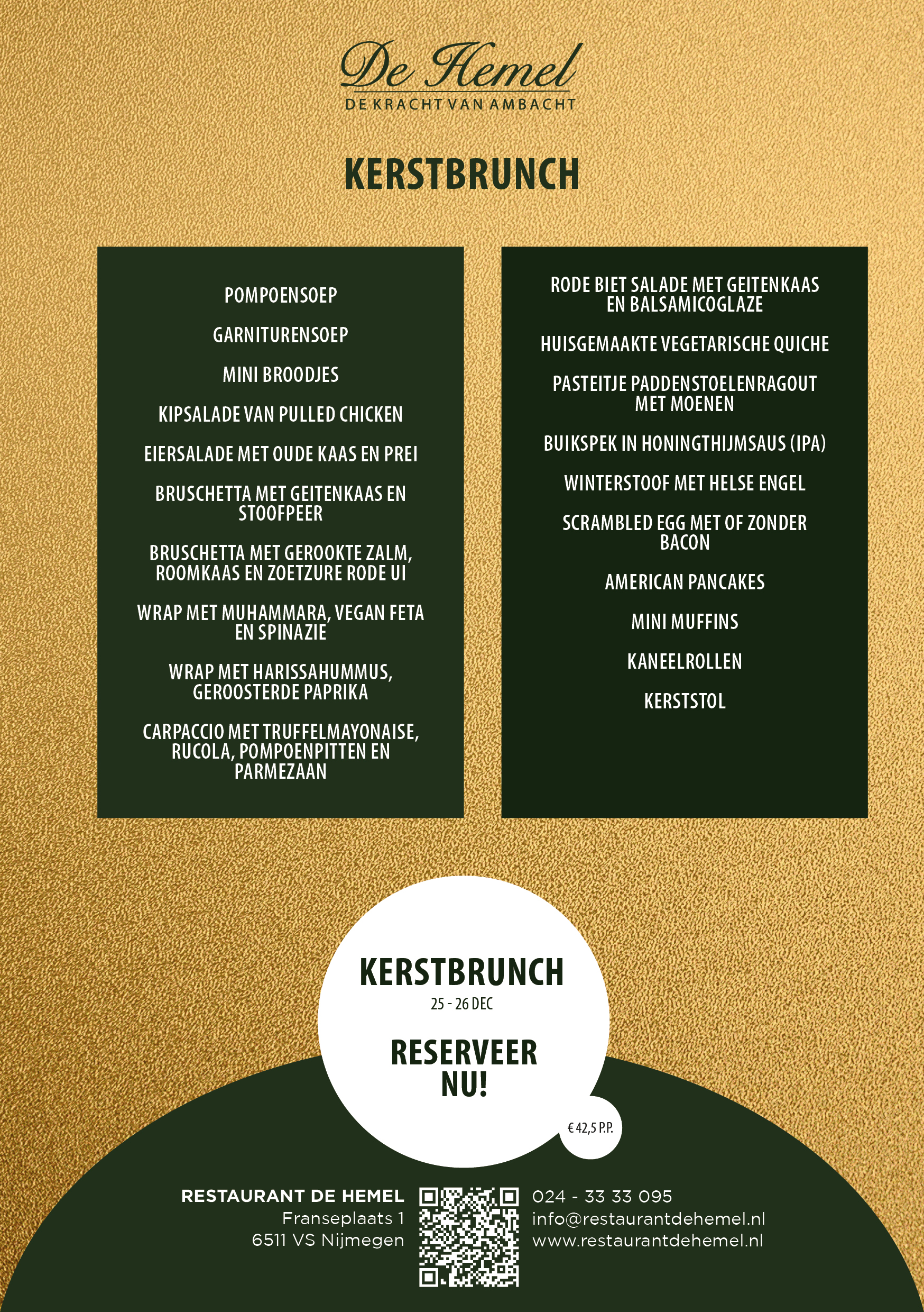 Bij de Hemel staan we klaar om u te verwelkomen voor een kerstviering die in het teken staat van lekker eten, warmte en verbondenheid. We kijken ernaar uit om samen met u deze bijzondere dagen te vieren. Reserveer snel, want onze kerstbrunches en diners zijn populair en de beschikbaarheid is beperkt!