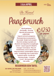 Pasen is dé perfecte gelegenheid om samen te genieten van goed eten, gezelligheid en de lente die in de lucht hangt. Vier Pasen in Nijmegen op een speciale manier! Bij Restaurant De Hemel ben je van harte welkom voor een uitgebreide paasbrunch of een heerlijk paasdiner. Laat je verwennen in onze sfeervolle, historische locatie in het hart van de stad!