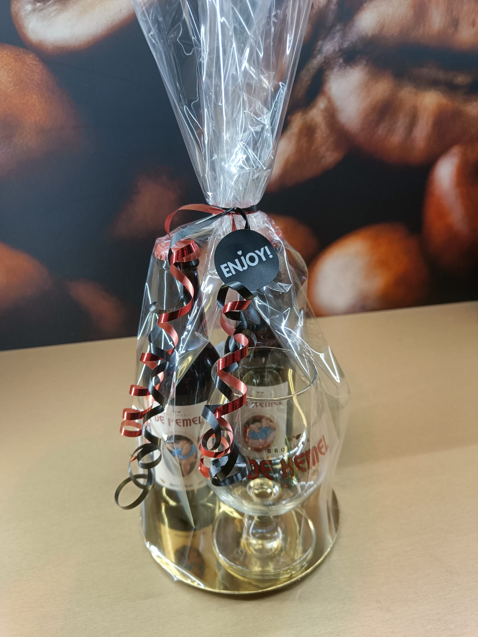 Een hemels bier pakket zorgvuldig samengesteld uit 4 verschillende bieren en een glas.