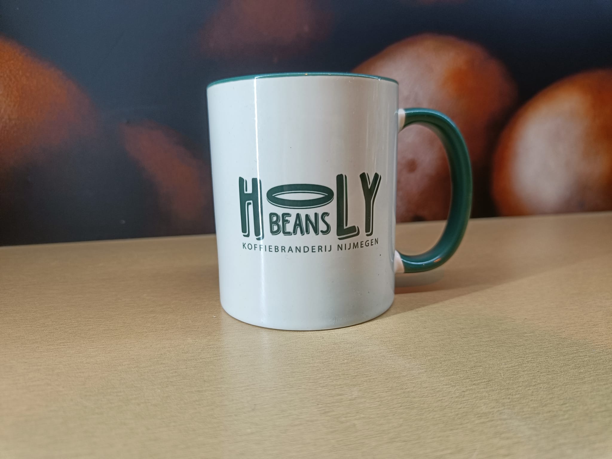 Een koffie mok van holy beans waar je onze heerlijke ambachtelijke koffie uit kan drinken